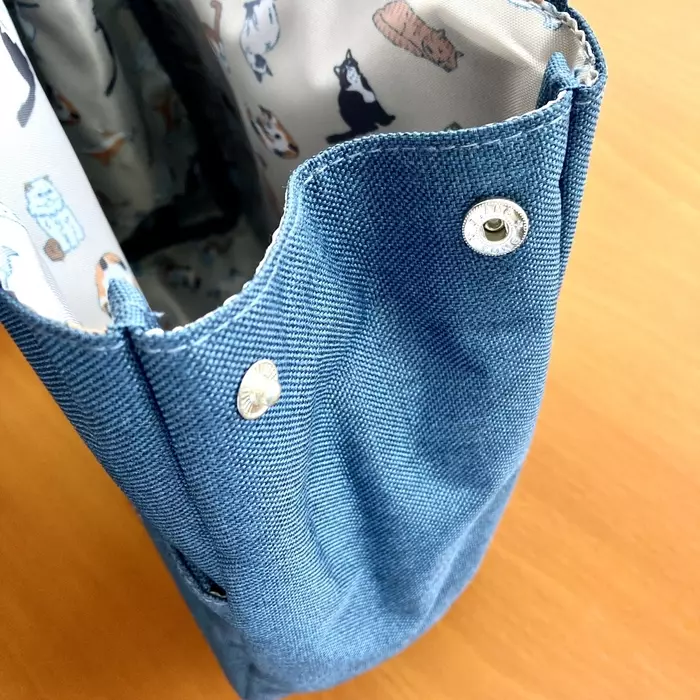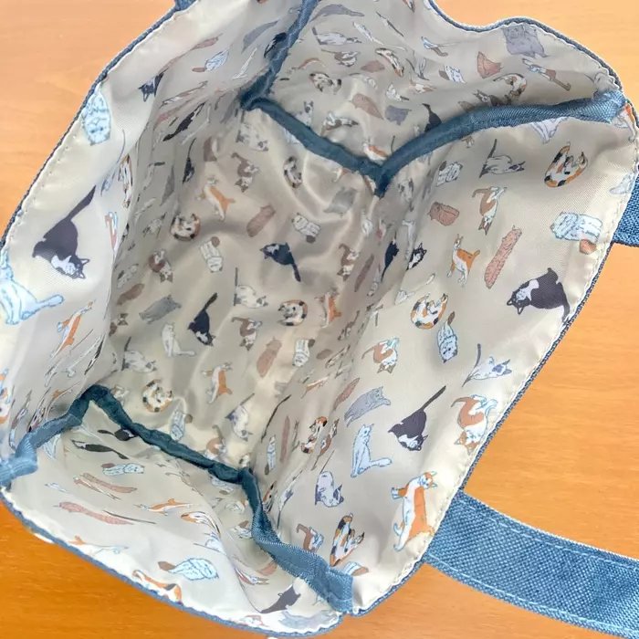 本やペットボトル、お財布、携帯電話を入れてもまだまだ余裕があります。さらに、裏地にはいろんな種類のネコのイラストが描かれていてカワイイ!