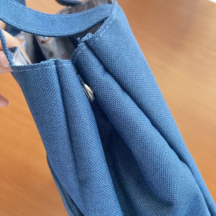 そしてお気づきかもしれませんが、両サイドにはスナップが付いていて、止めるとバッグの口から荷物が飛び出しにくくなります。