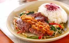 タイ風カレーペーストで簡単に味が決まる、エスニック炒め丼です。カレーペーストは、火で炒めて香りを出すだけで、美味しさが格段にアップ! 唐辛子の辛さと、ココナッツミルクのまろやかさとのギャップもやみつきになりますよ。一度食べるとハマッてしまいそうです。