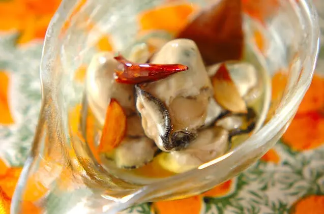ゆでたカキをオリーブオイルに漬け込んで冷やします。プリプリとしたカキの食感が絶品のこの料理。たくさん作って冷蔵庫にストックしておきたいおつまみです。
