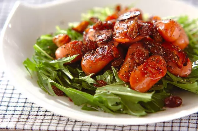 ラムレーズンの豊かな香りと甘み、そしてソーセージの塩気が合わさった絶妙な組み合わせの炒め物です。さっと作れてハイボールによく合います。