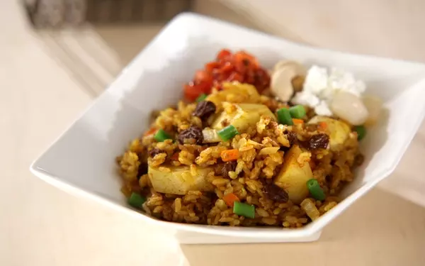 煮物に使うことが多い里芋を、カレーピラフに使うユニークなレシピです。野菜や牛ひき肉は炒めず炊飯器に入れるため、手が込んでいるように見えて実は簡単。カレー粉のスパイシーさにレーズンや野菜の甘みが相まってお代わりしたくなる美味しさですよ。