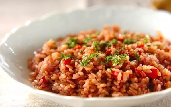 赤ワインの色が美しいピラフは、ふわりと広がる香りが大人向けのディナーにぴったり。ワインはリーズナブルなもので十分ですよ。少しだけ余ったワインを活用したいときにもおすすめ。顆粒スープの素でシンプルに味つけするため、グラタンやムニエルなどしっかり味の洋食献立に合わせるのも◎です。