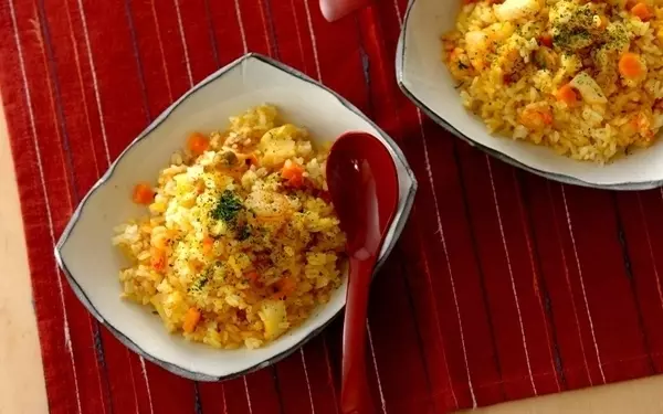 ごはんとカレー粉を炒めて、簡単ピラフを作りましょう。カレー粉の種類を変えることで、アレンジの幅がグッと広がりますよ。辛みの強いスパイスのひとつ、ガラムマサラを加えれば大人向けに。野菜はミックスベジタブルで手軽にしても良いですよ。