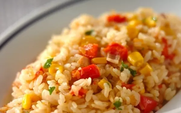 バターじょうゆの香ばしさが食欲をそそるピラフです。水煮コーンを使うので、旬の時期以外でも作れます。コーンの黄色とパプリカの赤色が目を引く一品は、冷めても美味しくお弁当にも喜ばれますよ。