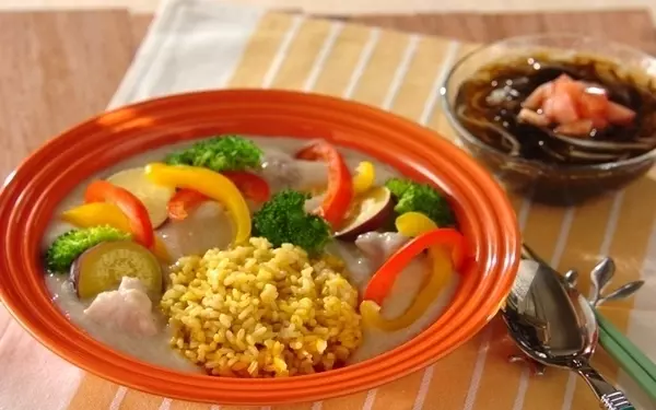 長芋やサツマイモ、鶏もも肉などで作る具だくさんのシチューは、自然なとろみが特徴です。ピラフに使うターメリックは、乾煎りして香りを引き出すのがポイント。玄米ご飯を炒め合わせた簡単ピラフをシチューに添えると、玄米独特の食感と相まって絶品ですよ。