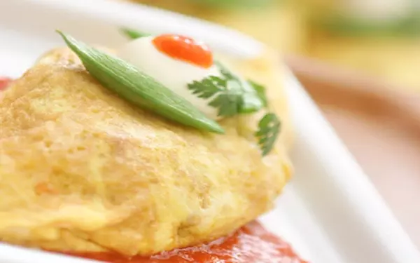 ピラフはオムライスにアレンジするのもおすすめ。こちらは、サツマイモとベーコンのピラフで作ったオムライスに、チリソース入りのトマトソースをかける一品です。サツマイモの甘みとソースの辛さが相性抜群。子ども向けにはチリソースなしのソースにしても良いですね。