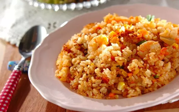 炒めて作るピラフは、忙しい日にもってこい。ケチャップやウスターソースにチリソースの辛味を加え、スパイシーに仕上げます。具材は玉ネギやハムのほか、コーン缶やベーコンなどでアレンジ自在。ピリ辛味が食欲を刺激し、お酒にもよく合いますよ。