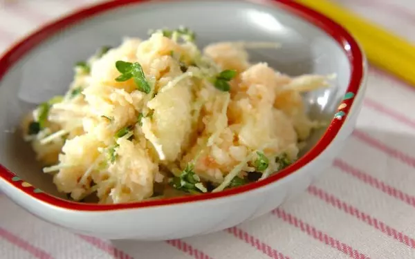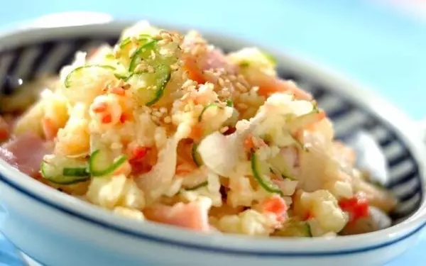 こちらは梅干しとマヨネーズで味つけする、和風ポテトサラダ。梅干しのほど良い酸味が効いていて、さっぱりといただけます。シャキシャキの玉ネギも良いアクセントに。味の濃いおかずの副菜におすすめです。
