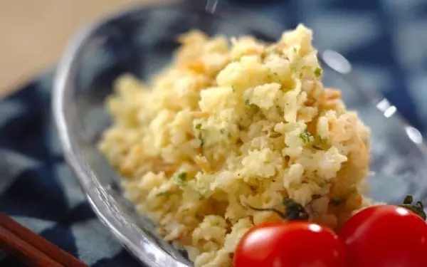 ちくわの穴にポテトサラダを詰めて、油で揚げて天ぷらに。残ったポテトサラダが少量でも、ボリュームアップできるのが魅力です。サクサクの衣と、温められてホクホクになったポテトサラダがよく合いますよ。明太子の辛みが効いているため、お酒とのペアリングも◎。