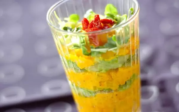 カボチャ入りの黄色いポテトサラダとレタスを、層になるようにグラスに盛りつけます。いつものポテトサラダも、盛りつけ次第でとってもオシャレなおもてなし料理に。玉ネギは炒めてから加えるので、甘めのポテトサラダに仕上がります。シャキシャキのレタスとも相性抜群です。