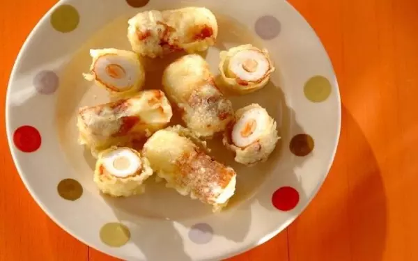 ちくわの穴にポテトサラダを詰めて、油で揚げて天ぷらに。残ったポテトサラダが少量でも、ボリュームアップできるのが魅力です。サクサクの衣と、温められてホクホクになったポテトサラダがよく合いますよ。明太子の辛みが効いているため、お酒とのペアリングも◎。