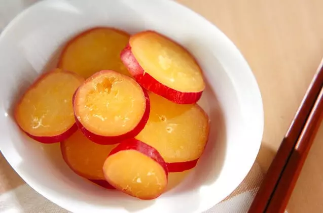 1、サツマイモは皮ごときれいに水洗いし、厚さ1.5cmの輪切りにして水に放つ。
