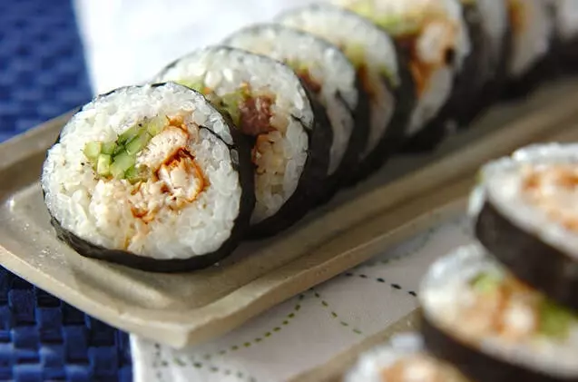 バターで焼いて風味をプラスしたブリの照り焼きを巻き寿司に! ごはんを広げたらユカリとゴマを振りましょう。味のアクセントになりますよ。