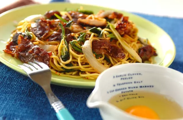 すきやき風の甘辛い照り焼き味の焼きそばです。生卵を絡めて召し上がれ!牛肉入りのちょっと豪華な焼きそばは週末のランチや鉄板を囲んだバーベキューなどにオススメです。