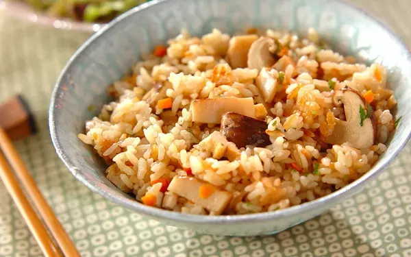 松茸と相性の良い油揚げを組み合わせた炊き込みご飯です。ニンジンが鮮やかで、華やかな見た目に。味つけはしょうゆや酒など基本調味料でシンプルに仕上げます。松茸の香りを堪能できますよ。