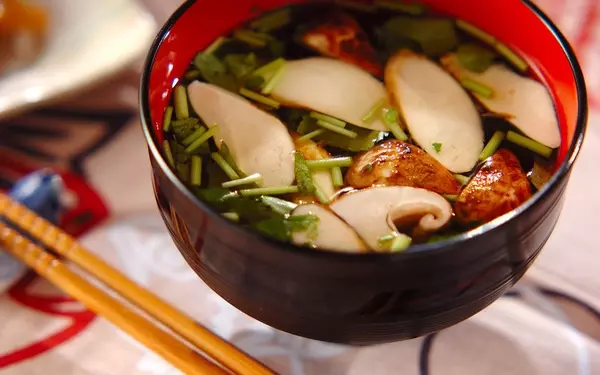 どんな主菜や副菜にも合わせやすいお麩のお吸い物。薄味のだしがしみたお麩がジュワッと美味しく、松茸ご飯と相性抜群です。お麩は焼き麩であれば何でもよく、カラフルな花麩もおすすめ。紅葉の形のお麩で季節感を出すのもステキですね。