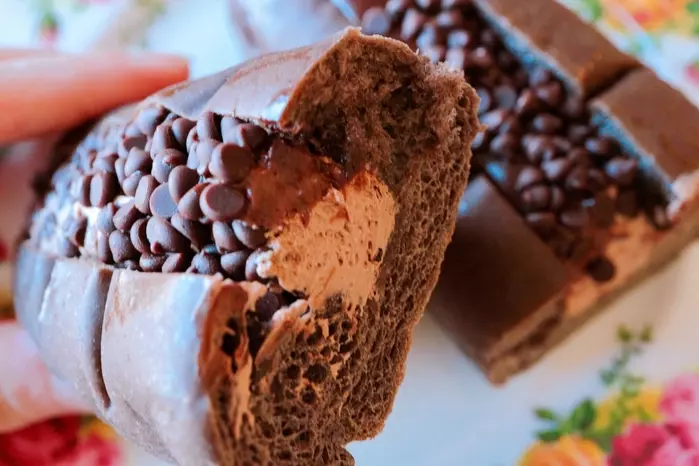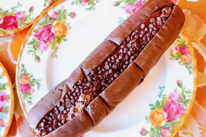 袋から出して長さを測ると…。約20cmありました!チョコレートクリームとチョコレートホイップがしっとりしたチョコレート風味生地でサンドされていて、こちらもチョコレート尽くし!食べるとトッピングのチョコレートチップがこぼれ落ちるくらいたっぷりのっています。パンの生地が柔らかいからか、チョコレートが想像以上に濃厚に感じられました。