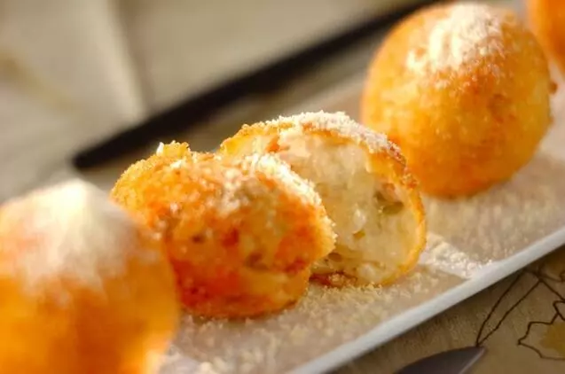 クリームシチューにごはんを混ぜてコロッケに!ボール状に丸めにくい場合は、1時間程度冷蔵庫に入れ冷やしておくと扱いやすくなります。とろけるチーズを中に入れても。