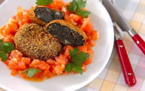 見た目のインパクト抜群なのが、イカスミペーストを混ぜ込むアイデアコロッケ。ペーストには魚介の旨みとコクが凝縮されているので、合びき肉と相まって奥深い味わいです。真っ赤なトマトで作ったサルサソースとともに盛り付けると、パーティーの主役になりますよ。