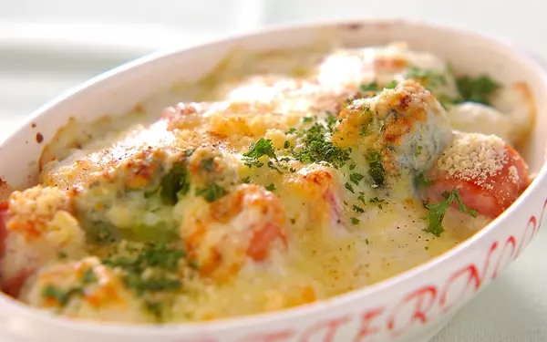 コロッケとホワイトソースを焼き上げると、ポテトグラタンのような一品に。ホワイトソースをレンジで作れば鍋を使わずに仕上げることができますよ。シンプルなポテトコロッケはもちろん、鮭やコーンなどのコロッケで作ってもOK。あまり細かく崩しすぎないほうが食感が良いです。