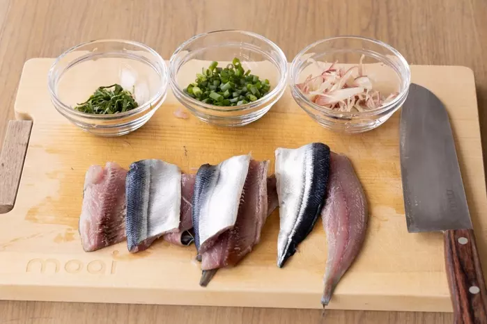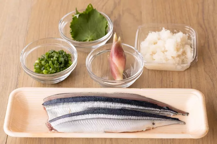 サンマは半分に切る。しそとみょうがは千切りにする。