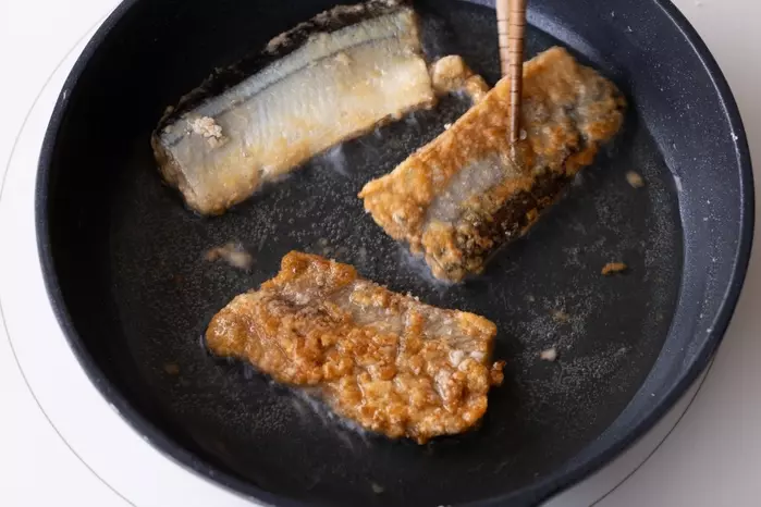 フライパンでサラダ油を中火で熱し、サンマがきつね色になるまで両面各1〜2分揚げ焼きにする。