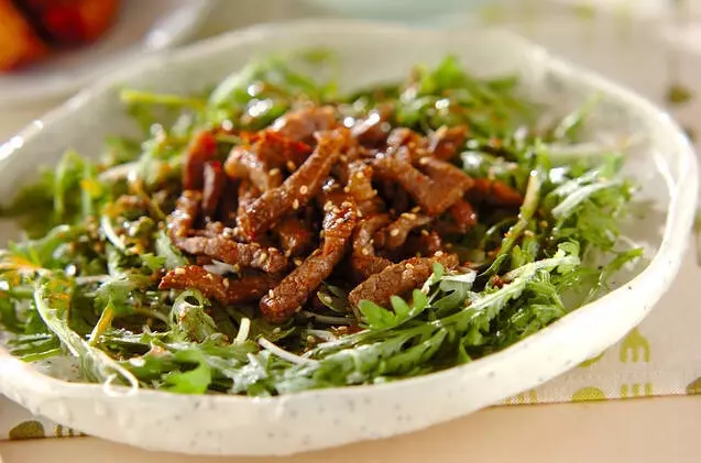 ・わさび菜を敷き詰める!「牛肉サラダ」