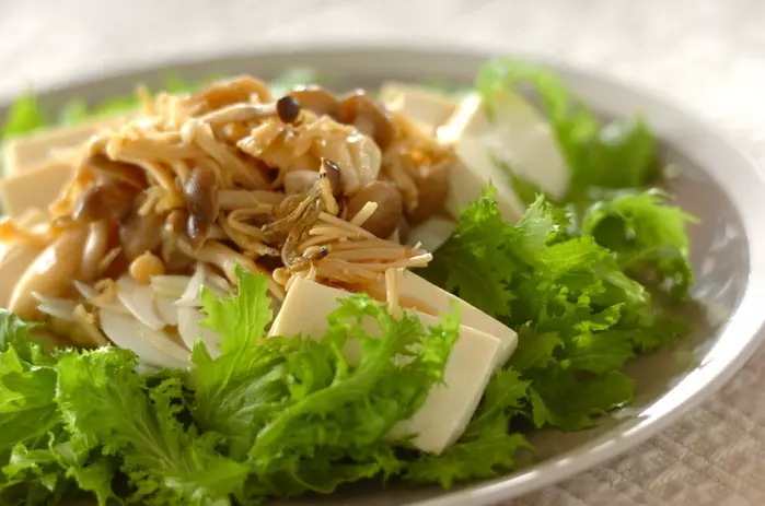 ワサビ菜のピリッとした辛さがアクセントになっている豆腐を乗せた低カロリーなサラダです。ジャコとキノコのうま味、そしてゴマ油の香りで満足感が得られます。ダイエット中や糖質制限中の方にオススメしたい一品です。