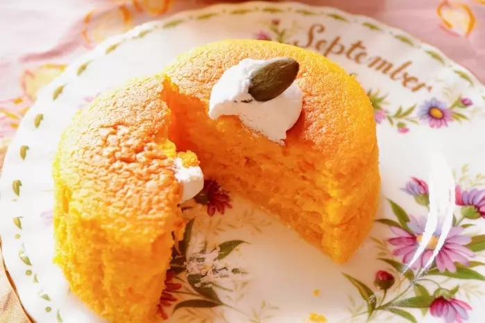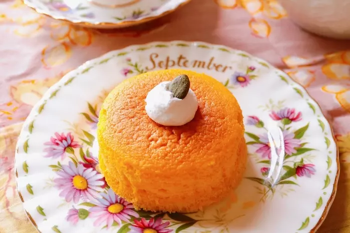 見た目からも分かるふわふわ感♪半分に割ると、スフレならではの、しゅわっとした触感です。音もしますよ…!スフレだけを食べてみると、かぼちゃの味わいがお口いっぱいに広がります。さっぱりとした味わいのホイップクリームとの相性も抜群です!