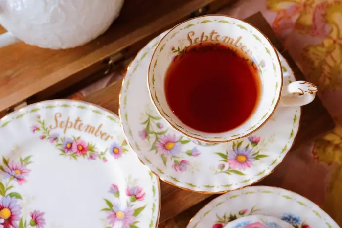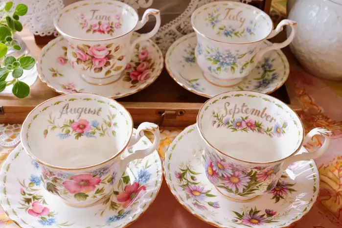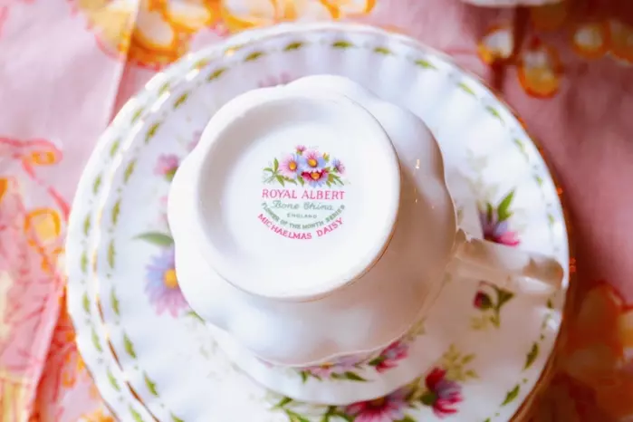 今回使用した食器は、イギリスの名窯「ロイヤルアルバート」の「フラワー・オブ・ザ・マンス」の9月のトリオです。ちなみにこの食器は、1月から12月まであり、その月を代表する花が描かれています。9月はミカエルマス・デイジーです。