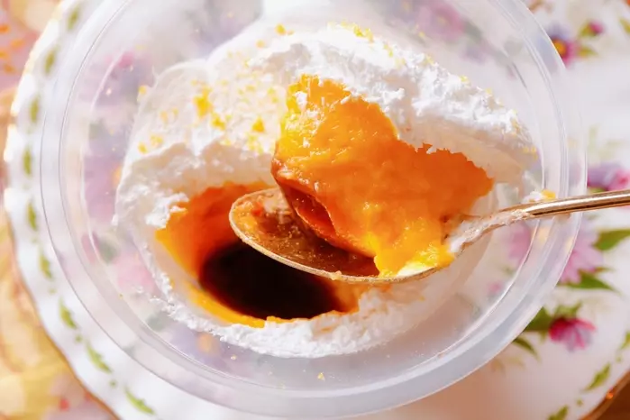 次は、かぼちゃのプリンを食べてみます!ホイップとプリン、カラメルソースの3層です。