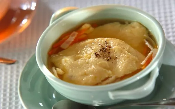 コンソメスープの上に、ふわっふわに泡立てた卵をトッピングするおしゃれな一品。卵と塩をハンドミキサーで泡立てるひと手間はありますが、驚きの食感で試す価値あり! 楽しみながら食べられて、おもてなしにもおすすめです。