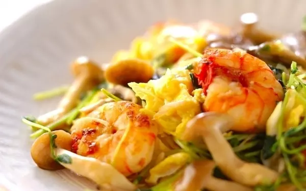 ・香りがたまらない! 豆苗とエビとホタテのバターじょうゆ炒め