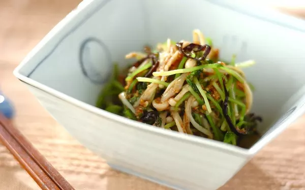 豆苗とキノコのヘルシー食材で作る、さっぱり味の和え物です。豆苗とエノキは同じ鍋を使い、時間差で茹でるため洗い物が少なく済むのが魅力。香ばしい白ゴマの風味抜群のタレとからめると、料亭のような一品を味わえます。