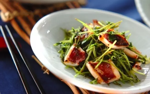 メイン材料は豆苗とイカだけ。シンプルな組み合わせが抜群の主菜です。ゴマ油で手早く炒め、塩と粗びき黒コショウで味付けすれば完成の手軽さが良いですね。粗びき黒コショウはしっかり効かせるとパンチのある味わいになりますよ。