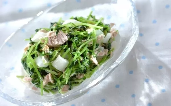 豆苗とツナで作るサラダ仕立ての和え物。生の豆苗の苦みが気になる方でも、茹でると甘みが増し、ツナの風味と相まって食べやすいですよ。あっさり仕上げるため、ツナはノンオイルがおすすめ。粗びき黒コショウを多めに振っても美味しいです。