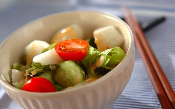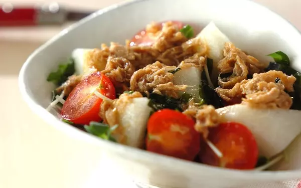 梨と大根のサラダはみずみずしく、揚げ物や濃いめの味付けの主菜にぴったりです。梨と野菜は同じぐらいの大きさにカットすると食べやすいうえ、見た目もキレイに仕上がりますよ。あらかじめショウガ汁やゴマ油などの下味にからめておき、食べる直前にドレッシングを混ぜるのがポイントです。