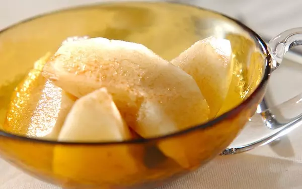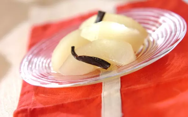 梨のコンポートにシナモンスティックやクローブを使うと、スパイシーな風味に。こちらのレシピでは、切った梨ひと切れにクローブを刺し、白ワインやシナモンスティックなどと一緒に煮ます。梨のさっぱりとした甘みとスパイスが意外なほど好相性。