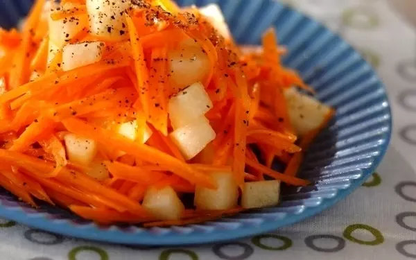 ニンジンはせん切り、梨は角切りにすることで食感のコントラストが際立ちます。オリーブオイルや酢などで作ったドレッシングで全体を和えたら完成。梨の甘さとドレッシングの塩気のバランスがちょうど良く、もりもり食べられます。
