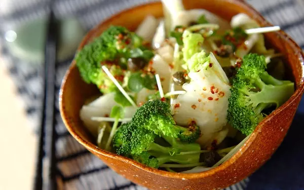 レンコンと梨の白さが目を引くサラダは、おしゃれなサラダを作りたいときにうってつけ。レンコンはサッと茹でて、熱いうちにドレッシングをなじませましょう。粗熱がとれたら梨を加えて出来上がり。プチッとした食感が特徴のトンブリがアクセントになりますよ。
