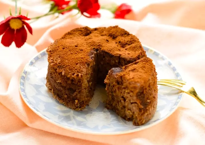 6、取り出したら、ふんわりラップをかけ、荒熱を冷ます。冷蔵庫に入れて、冷やす。皿にとり、キャロブパウダー(分量外)を上から茶こしで振る。食べやすくカットする。