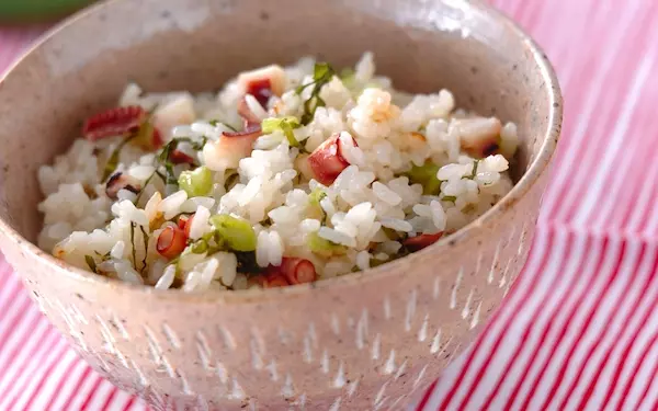 炊飯器にお米と合わせ調味料を入れ、タコ、昆布をのせてからスイッチをオンにすればOK。炊き上がったら、昆布を取り出して10分くらい蒸らし、野沢菜を加えましょう。しゃもじで、出来上がったタコ飯と炊飯器の間を1周して隙間を作り、底から持ち上げるようにふんわり混ぜるのがポイントです。