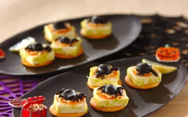 インパクト絶大! 真っ黒なスパイダーに思わずギョッとしますが、その正体は「ブラックオリーブ」。クリームチーズやスモークサーモンを合わせるため、お酒のおつまみにも良さそうです。片手で食べられるフィンガーフードはパーティーで重宝しますね。