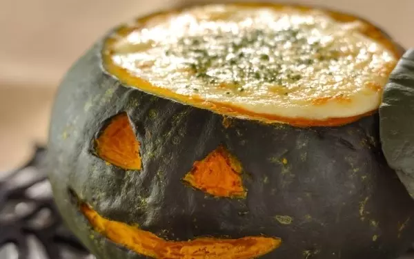 カボチャを贅沢に丸ごと使って、ごちそう感たっぷり! レンジで加熱して中身をくり抜いたら、具材を詰め、チーズをたっぷりのせてオーブン焼きにします。カッターで切り抜いて顔を作れば、見た目もにぎやかですね。