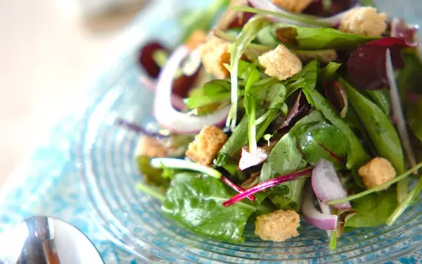 ゴマのような香りが特徴のルッコラは、生姜焼きとよく合います。甘みのある紫玉ネギとルッコラのほろ苦さが大人向け。白ワインビネガーや刻んだブラックオリーブが入ったドレッシングはさっぱりしていて食べやすいですよ。