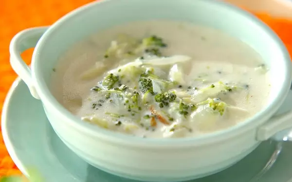 牛乳で作るクリームスープは、意外にも生姜焼きに合いますよ。甘辛い生姜焼きにまろやかなスープが格別で、大人にも子どもにも好まれる一杯です。ブロッコリーがやわらかくなるまで煮込むため、野菜が苦手な子どもにも喜ばれること間違いなしです。