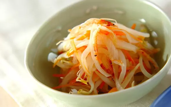 シャキッとした野菜の歯ざわりを楽しむ酢の物です。モヤシは太いものを選び、ニンジンや玉ネギとともにサッと茹でましょう。熱いうちに合わせ甘酢をからめ、炒った干し桜エビで香ばしさをプラスするのがポイントです。