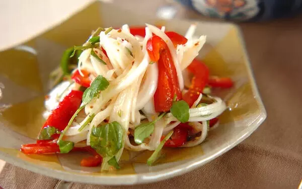 生姜焼きは濃いめの味付けにすることが多いため、酸味のある副菜を献立に取り入れるとさっぱり食べられます。ワインビネガーや粒マスタードなどで作ったマリネ液に、玉ネギや赤パプリカ、クレソンを混ぜればOK。火を使わないので、忙しい日でもパパッと作れますよ。