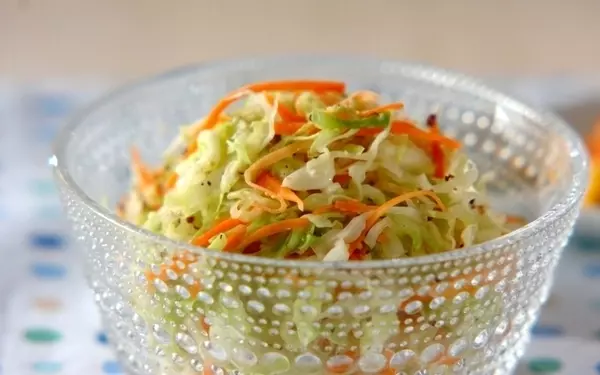 マヨネーズと粒マスタードを効かせたサラダは、酸味が効いて生姜焼きによく合います。調味料がなじむよう、キャベツやニンジンを塩もみして水分を絞っておくのが美味しさの秘訣。子ども向けにはコーン缶をプラスしても良いですよ。